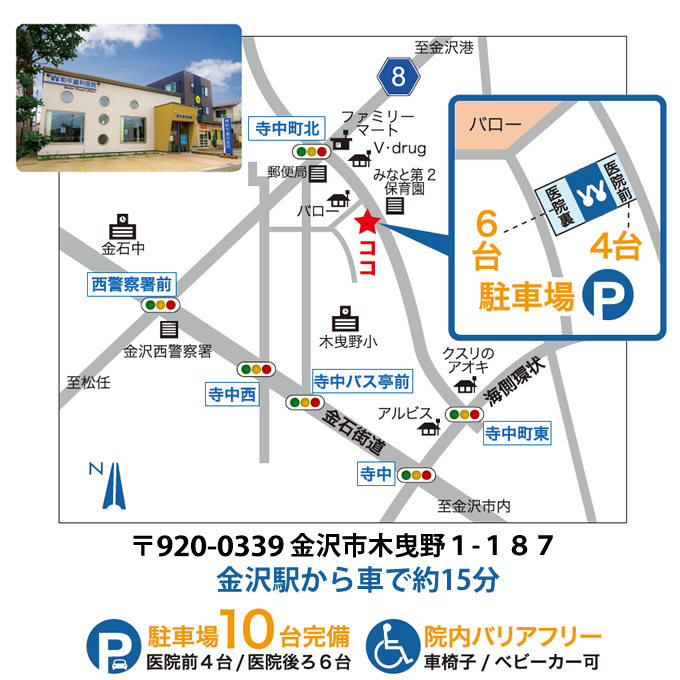 和平歯科医院は、金沢駅から車で15分、金沢市木曳野にあります。落ち着いた雰囲気のある環境にあり、室内は清潔感あふれる白と茶を基調とした歯医者さんです。